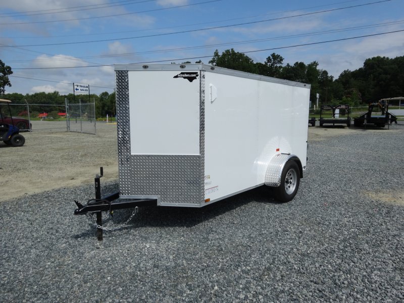 “This v-nose 5×10 enclosed cargo trailer has a single non-braking idler axle with a rating of 2,990 lb GVWR. This type of trailer is ideal for light-duty or residential tasks. This model has no side door, a rear ramp door, and a 2000 lb jack.