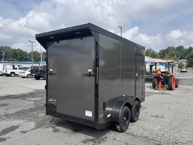 “This v-nose 6×12 enclosed cargo trailer has a single non-braking idler axle with a rating of 7,000 lb GVWR. This deluxe model has a side door, a rear ramp door, 0.030″” thick metal sides, a slant v-nose, rear wing with lights, blackout package (black rims, trim, ATP), and a 2000 lb jack.