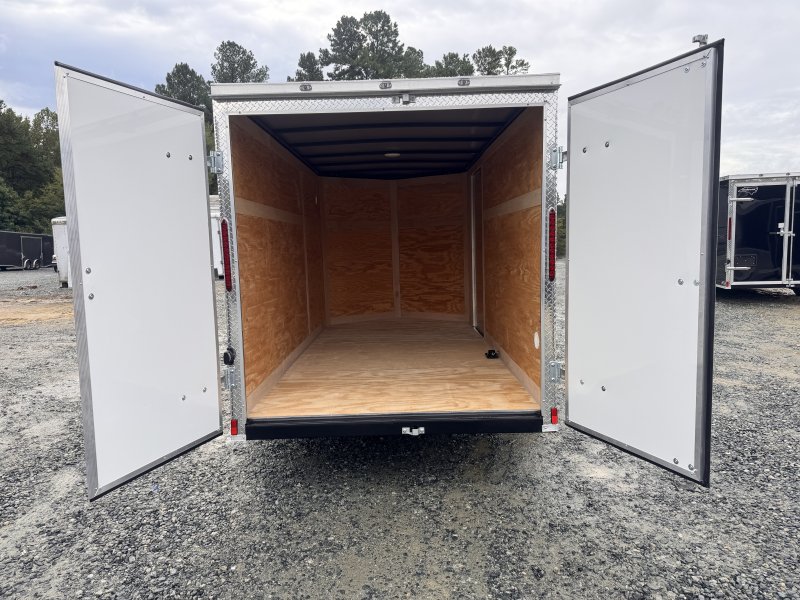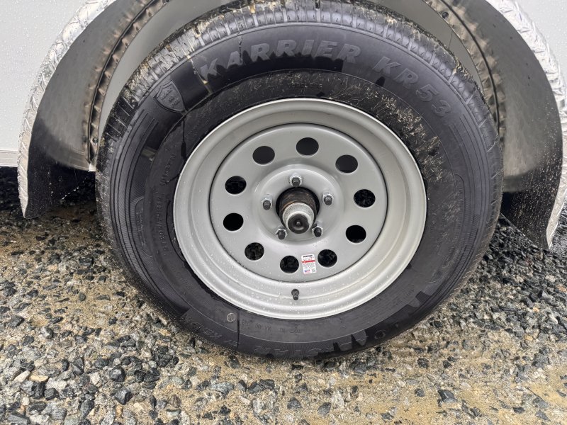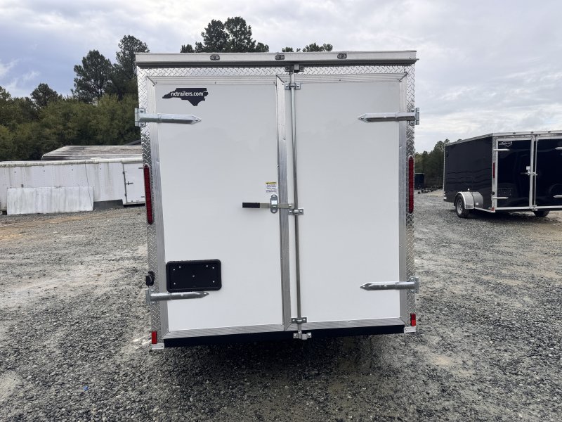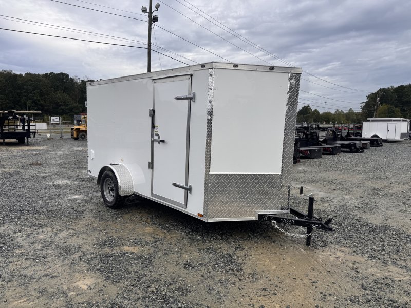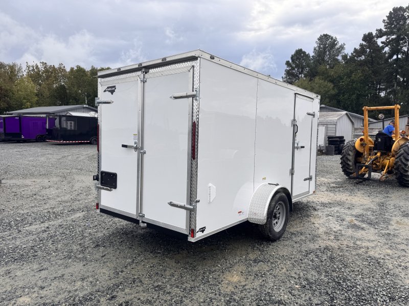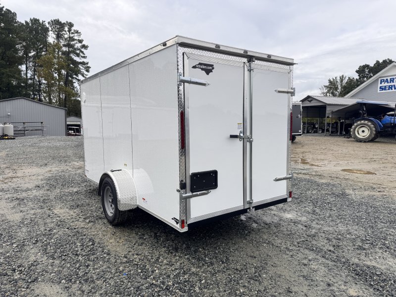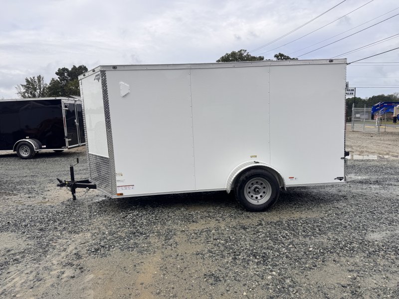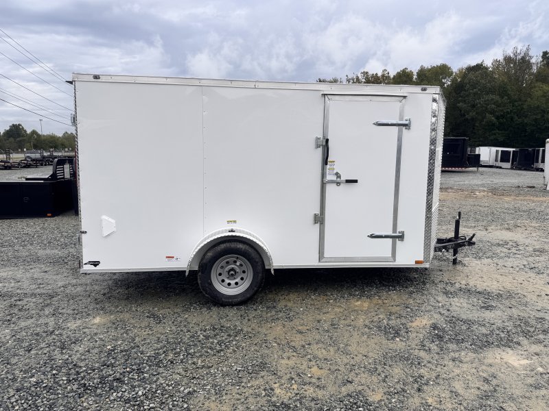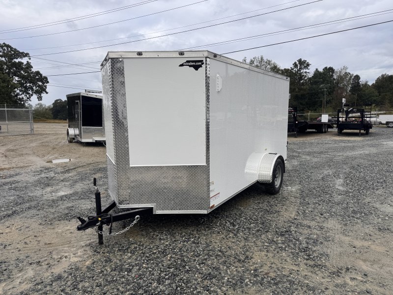 “This v-nose 6×12 enclosed cargo trailer has a single non-braking idler axle with a rating of 2,990 lb GVWR. This type of trailer is ideal for light-duty or residential tasks. This model has a side door, a rear barn door, and a 2000 lb jack.