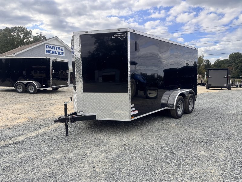 “This v-nose 7×14 enclosed cargo trailer has a 6’3″” interior height, .080 exterior siding, tandem axles with brakes with a rating of 7,000 lb GVWR. This model has a side door, a rear ramp door, and a 2000 lb jack.