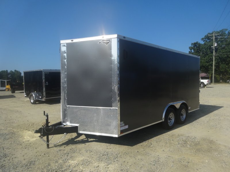 “This v-nose 8.5×16 enclosed cargo trailer has a 6’6″” interior height, tandem axles with brakes with a rating of 7,000 lb GVWR. This type of trailer is ideal for light-duty or residential tasks. This model has a side door, a rear ramp door, and a 2000 lb jack. .080 Exterior Metal.