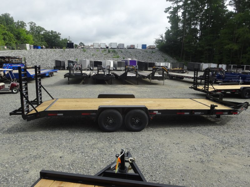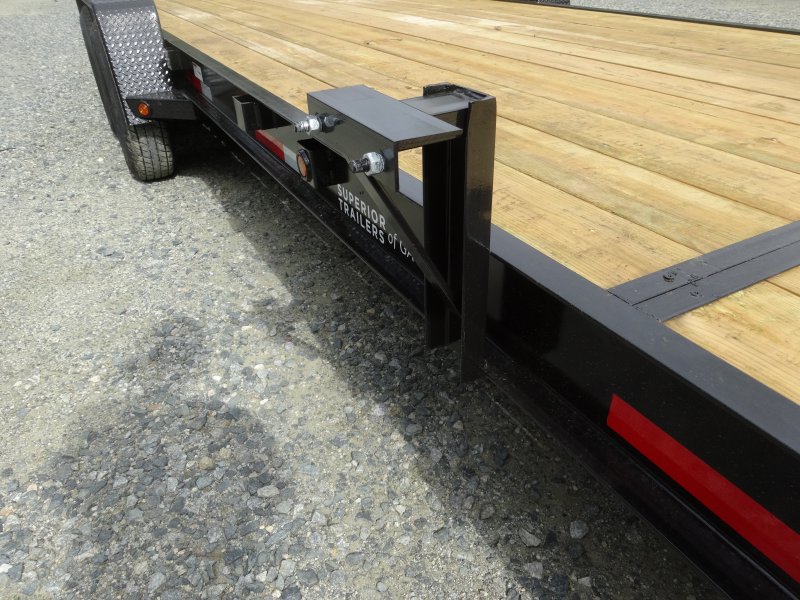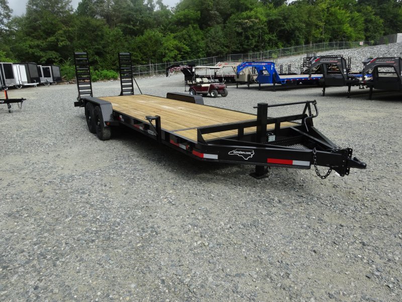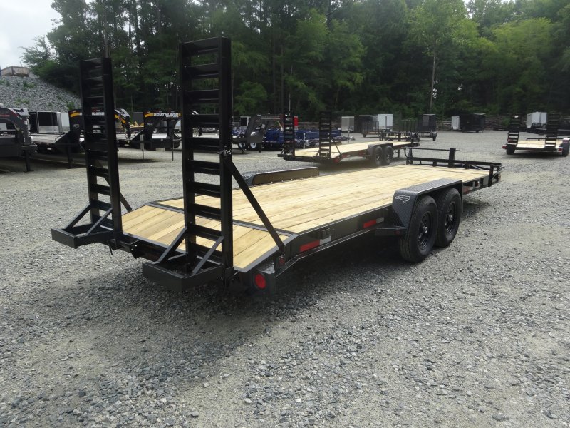 This standard equipment trailer comes with two 7,000 lb axles, 78″ wide deck (between the fenders), a dovetail, and fold-down ladder ramps.