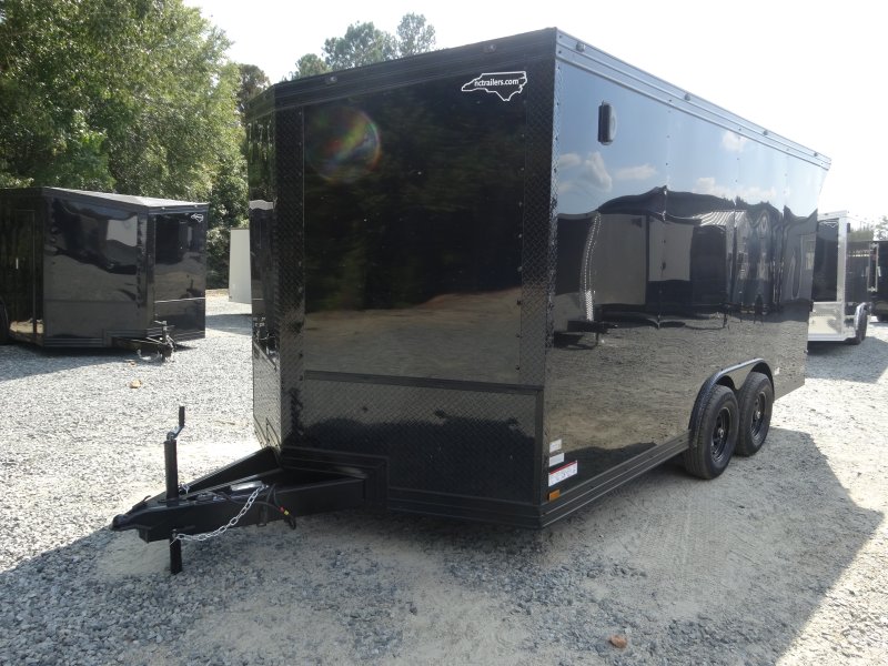 “This v-nose 8.5×16 enclosed cargo trailer has a 7′ interior height, tandem axles with brakes with a rating of 10,000 lb GVWR. This Pro Series model has a side door, a rear ramp door, 0.080″” polycore sides, a slant v-nose, rear wing, blackout package (black rims, trim, ATP), and a 2000 lb jack.