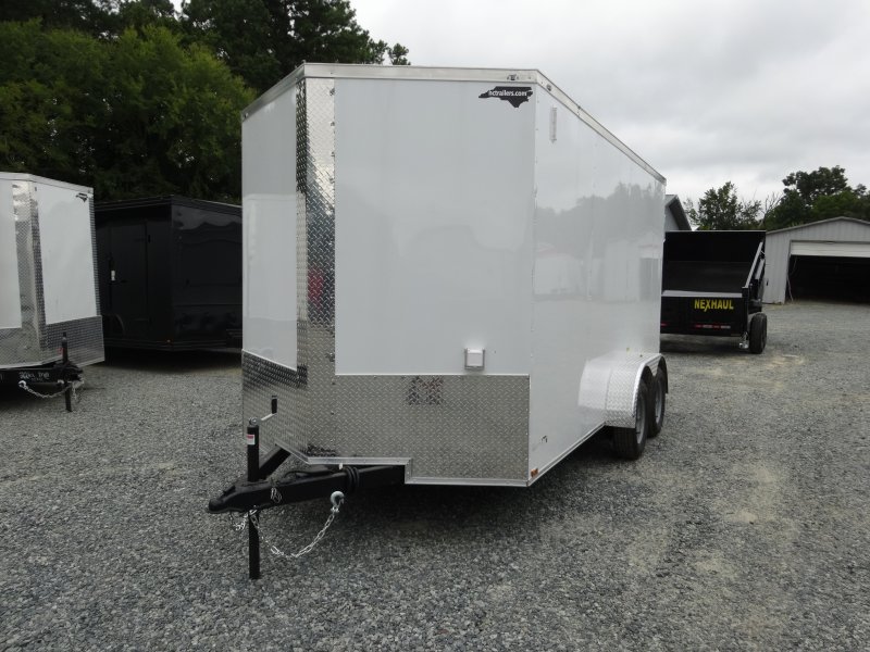 “This v-nose 7×14 enclosed cargo trailer has a 7′ interior height, tandem axles with brakes with a rating of 7,000 lb GVWR. This model has a side door, a rear barn door, 3×8 concession window, is braced and wired for A/C, 50 amp electrical package, 50 amp motor base plug, MC cable, and a 2000 lb jack.