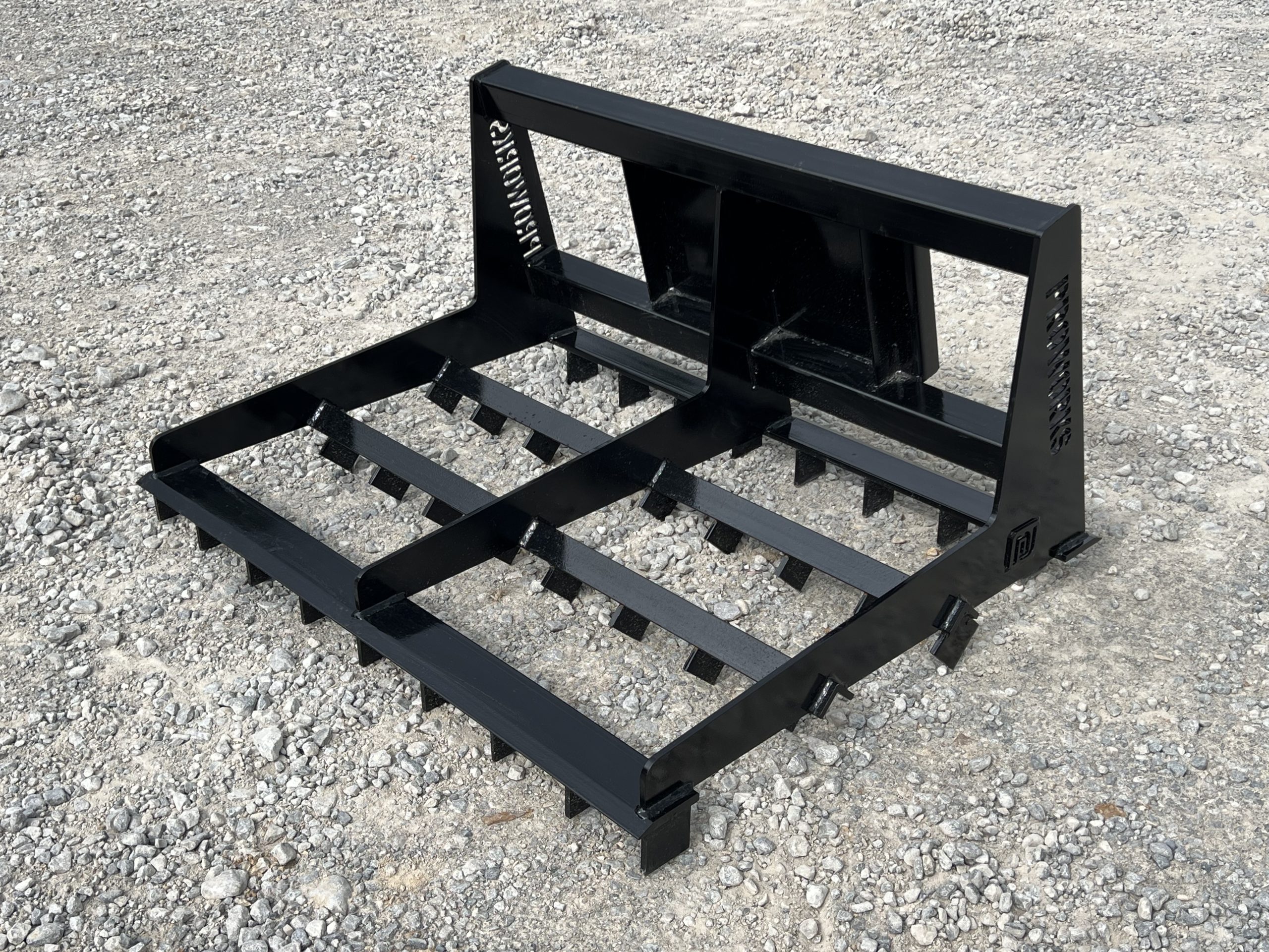 This is a brand new 48″ wide heavy duty land leveler attachment for a mini skid steer loader. The land plane attachment is great for quick and accurate grading. Unit has cutting edges, both front and back, allowing cutting hard surfaces and heavy angled tines in between to sift and spread dirt or gravel to low areas. The addition of the scarifier teeth allows for even better break up of hardened and compacted dirt.This mini universal mounting system is designed to fit the Toro Dingo, Vermeer, Ditch Witch, Finn, Ramrod, Boxer, Thomas and many more machines.