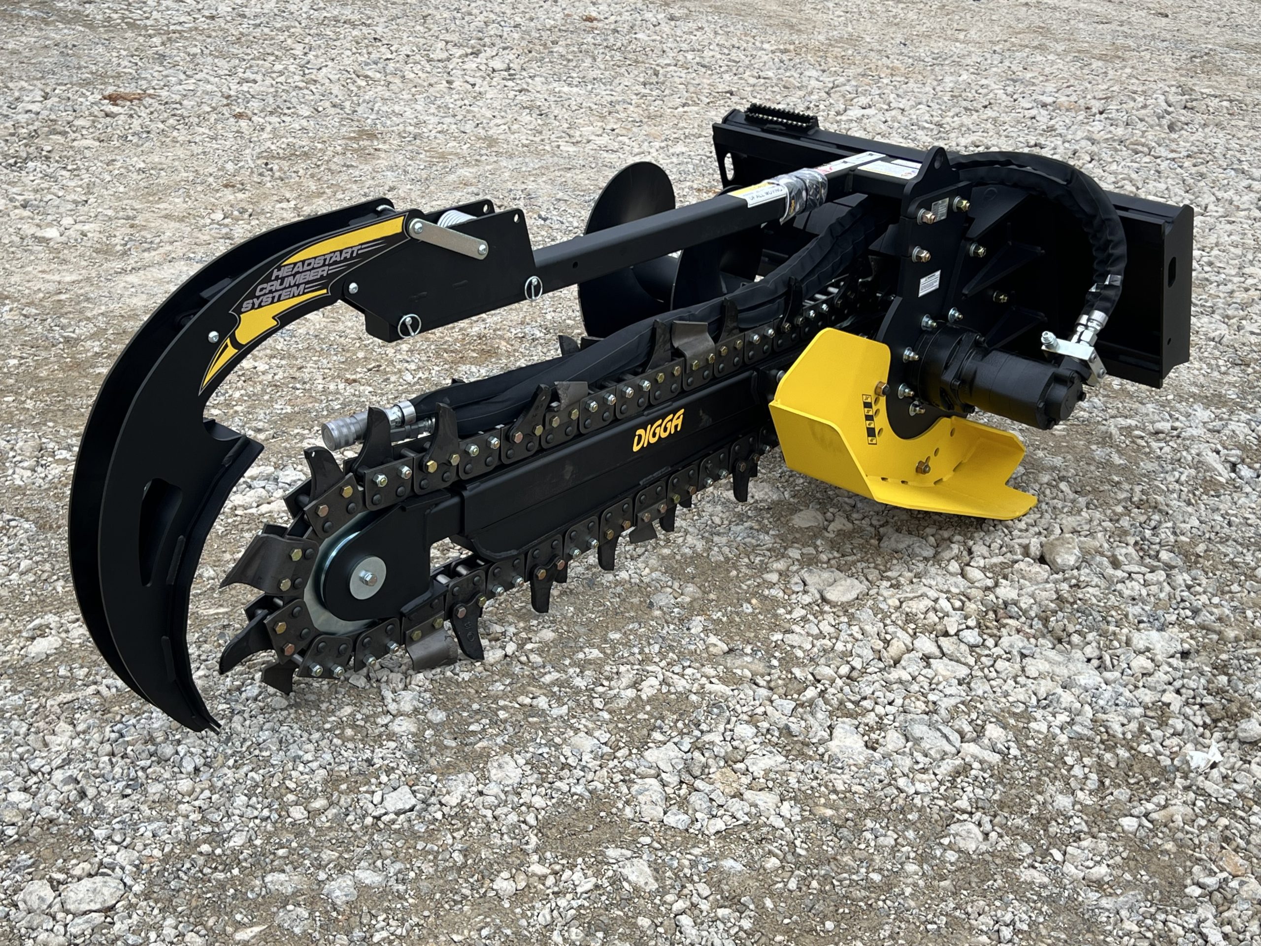 Equipped with Digga’s Combination Chain configuration (cup teeth and tungsten shark teeth), it is suitable for most applications. Will cut through hard soil, roots, soft shale, and rocky conditions. The adjustable depth control foot ensures precise trench depth every time, while the patent-pending crumber bar starts in the trench—eliminating the need for manual resets.