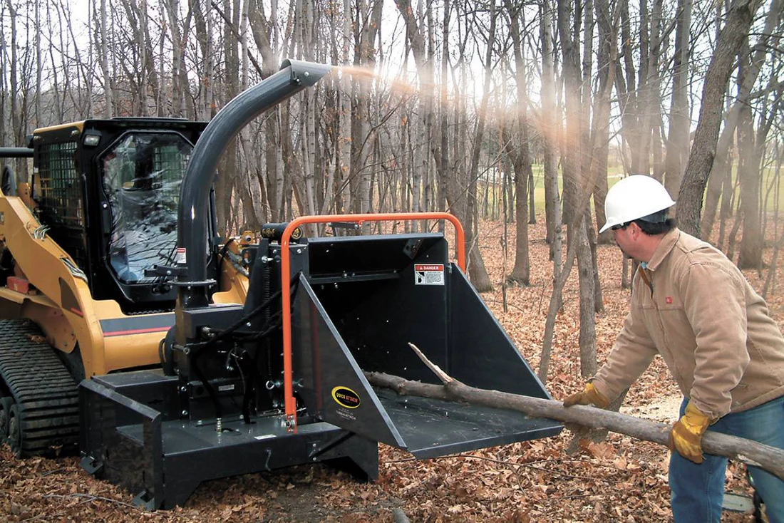 Turn your skid steer into a mobile work station. This attachment is ideal for commercial, residential, orchards, golf courses, etc., any place where you need to turn a pile of branches into a pile of chips. Easily placed into backyards and remote areas without creating damage to yards.
